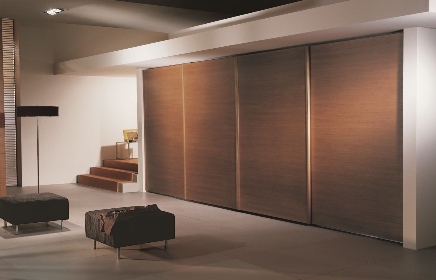 En amplios paños de roble americano con veta horizontal, libre de herrajes y variedad de lustre. Definen un ambiente sobrio y con alto valor de diseño, enchapado en madera. Puertas deslizantes enchapadas en madera, con varias opciones de luestre. Posee perfiles verticales de madera maciza.
